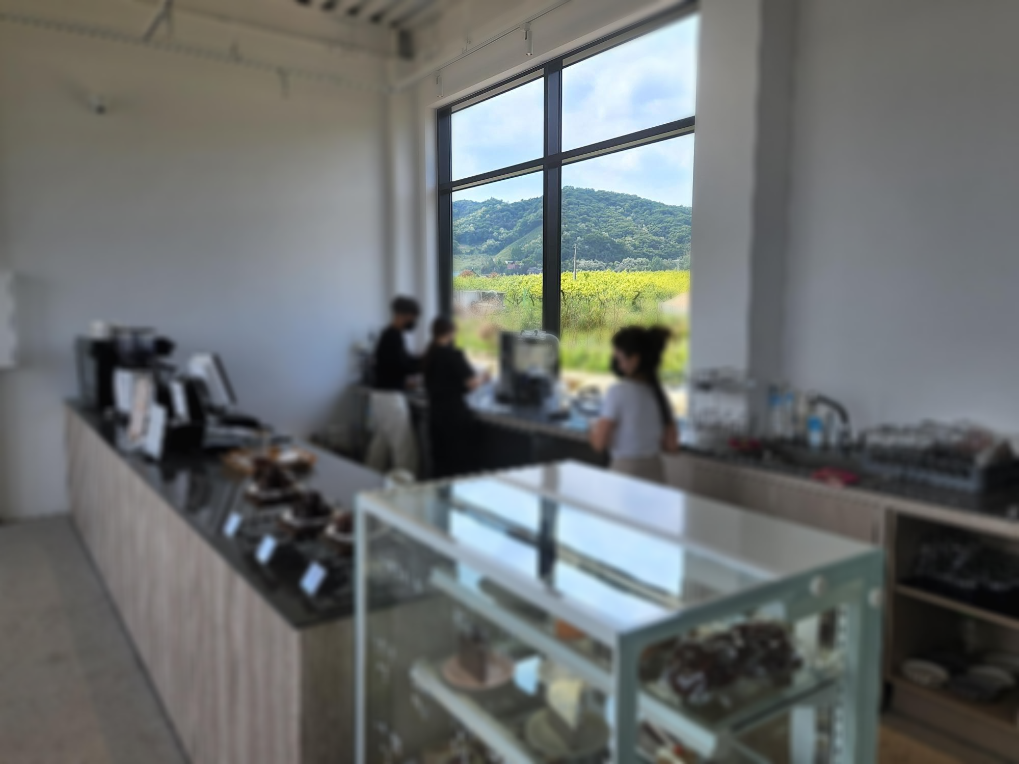 음료가 나오고 이 카페 어디서든 보이는 논밭 뷰와 함께 한 장