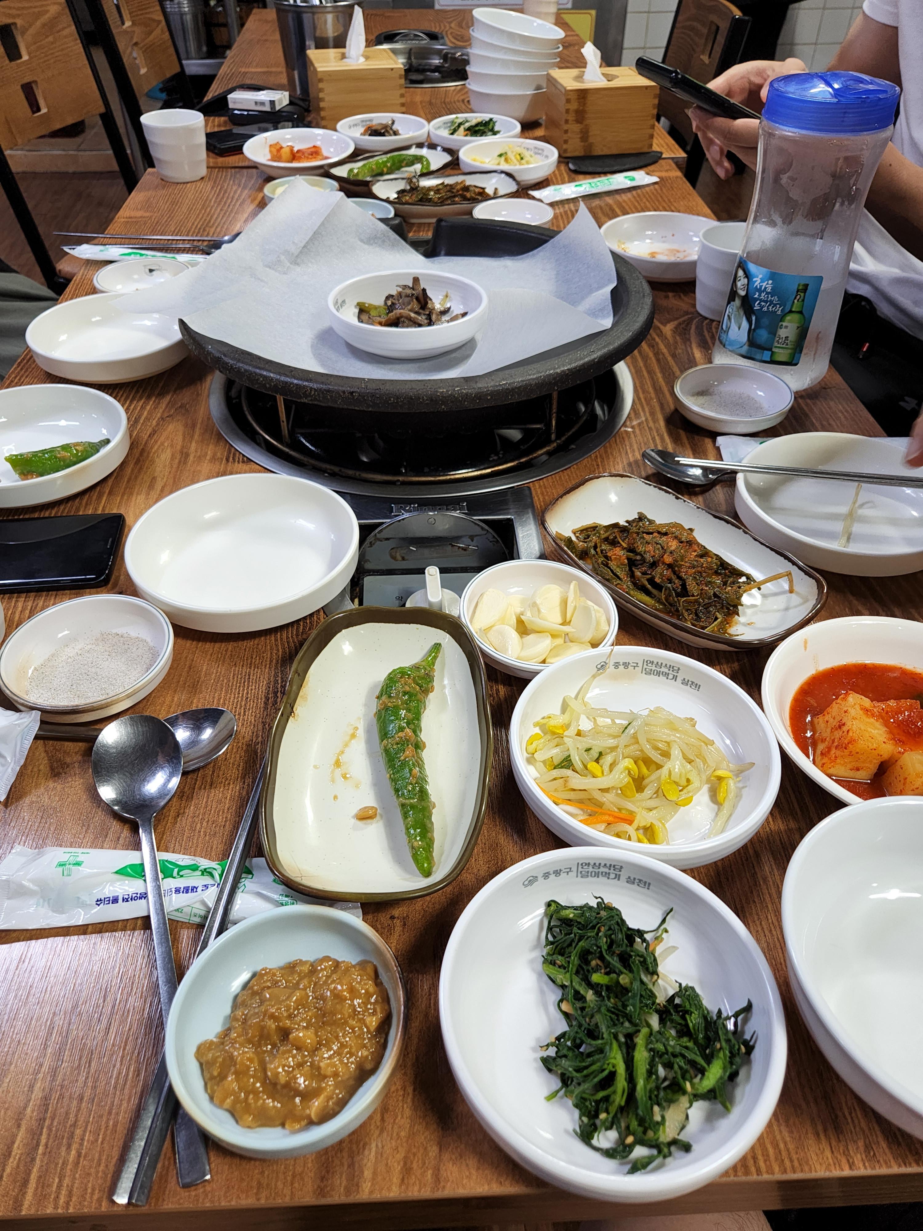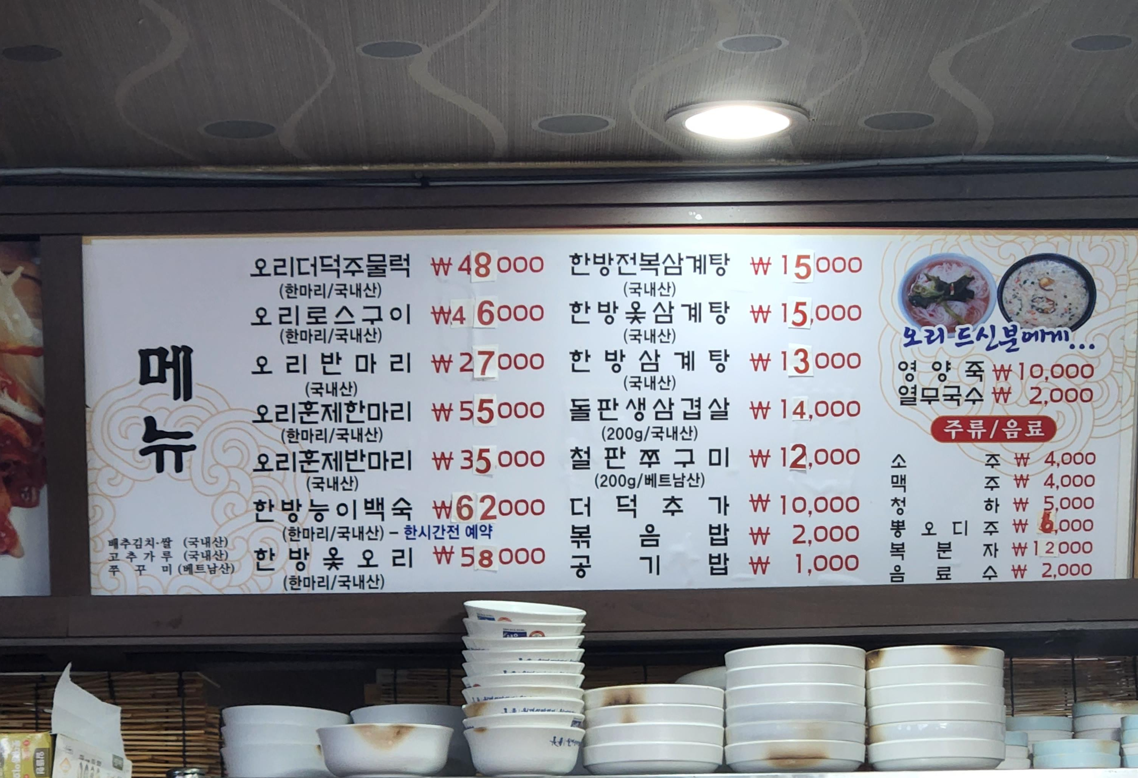 우리가 주문한 것은 오리 더덕 주물럭과 한방 능이백숙입니다.